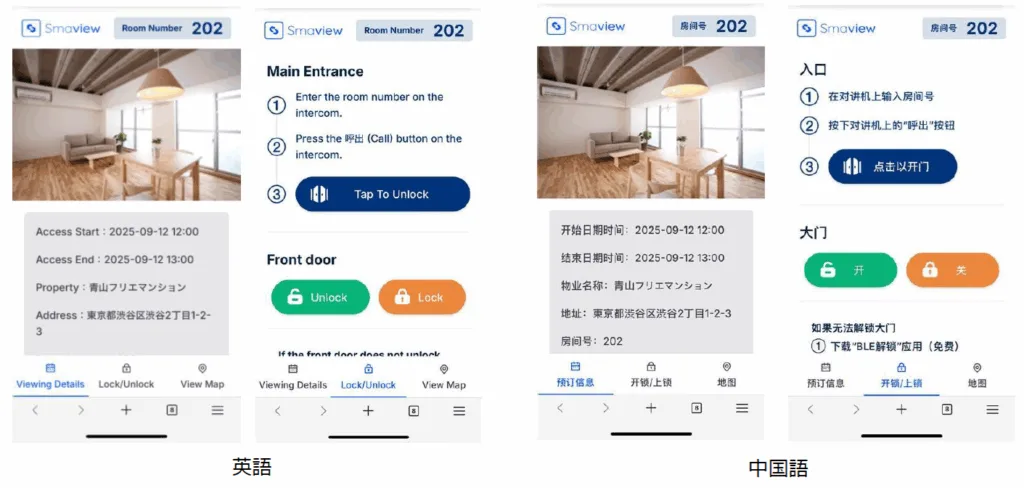 旅行者による民泊物件の入退出、および住宅内見において入退出管理サービスを提供している「Smaview 2.0」でも、英語や中国語でのご案内・操作環境の整備が急務となっています。こうした状況を受け、予約情報画面や解錠画面などサービス利用に関する一連の表示を多言語化し、外国人利用者にとって直感的に操作できる環境を実現しました。