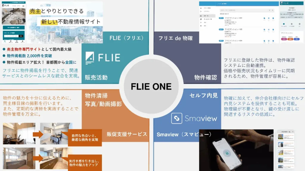 FLIEは主に首都圏や支店を構える北海道・大阪エリアにて、物件管理・内見・販売支援までをオールインワンで支援するDX支援パッケージ「FLIE ONE」を提供し、業務効率化と物件販売の仕組みづくりを後押ししています。